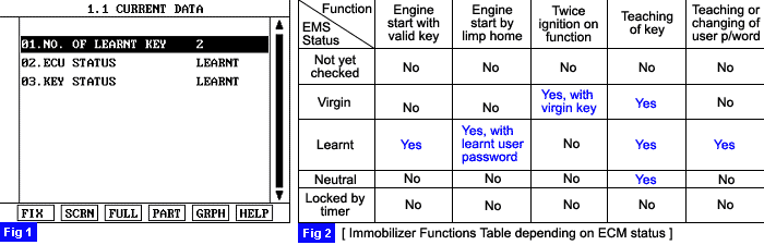 Current Data from Immobilizer will show the numbers of Key learnt, ECM status, and Key status as Fig 1.