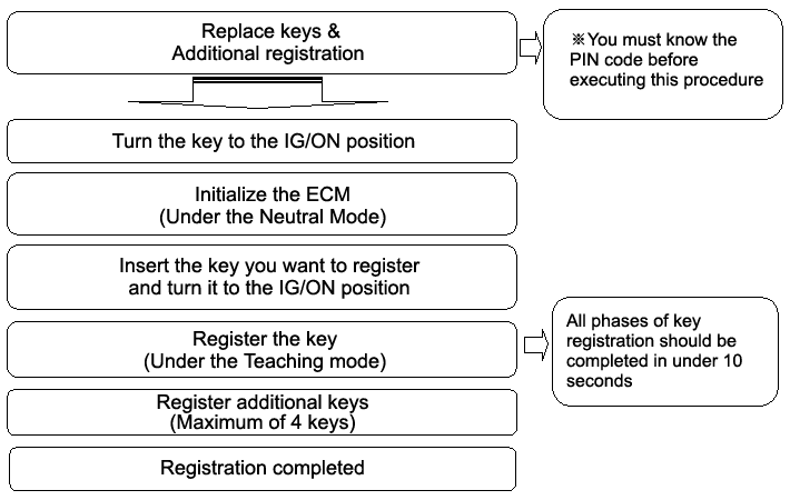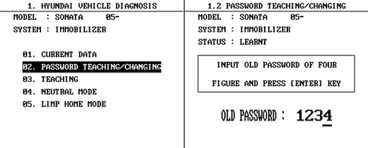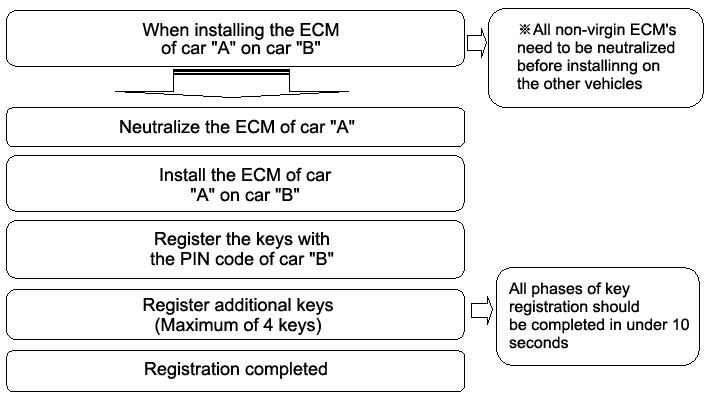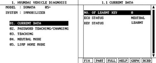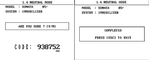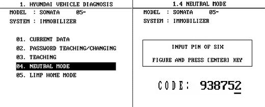 This function is for neutralizing the ECM and Key. ex)When lost key, Neutralize the ECM then teach keys.(Refer to the Things to do when Key & PIN Code The ECM can be set to the “neutral” status by a scanner. A valid ignition key is inserted and after ignition on is recorded, the ECM requests the vehicle specific data from the scanner. The communication messages are described at ” Neutral Mode”. After successfully receiving the data, the ECM is neutralized.