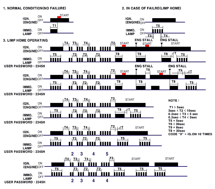 The limp home can be activated also by the ignition key. The ECM informs the driver by blinking the immobilizer indicator for the limp home condition. Then the user password can be input to ECM that can be done by special sequence of ignition on/off as picture above. Only if the ECM is in status “learnt” and the user password status is “learnt” and the user password is correct. the ECM will be unlocked for a period of time (30 sec.). The engine can be started during this time. After the time has elapsed, engine start is not possible. After a new password has been input the timer (30 sec.) start again. After ignition off the ECM is locked (If timer 8 sec. is elapsed). For next start the input of user password is requested again.