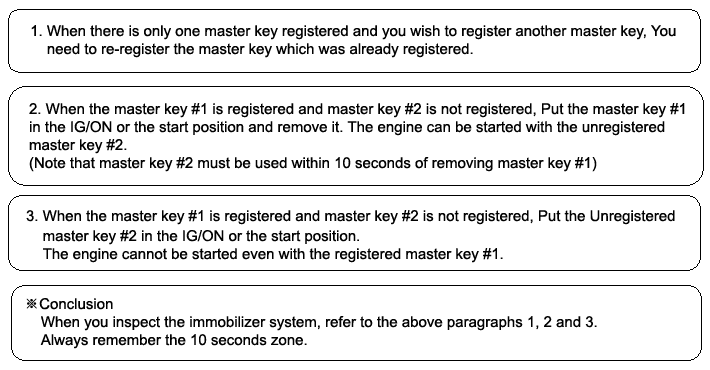 If an error occurs during the Immobilizer Service Menu, the ECM status remains unchanged and a specific fault code is stored. If the ECM status and the key status do not match for teaching of keys, the scanner procedure will be stopped and a specific fault code will be stored at ECM.
