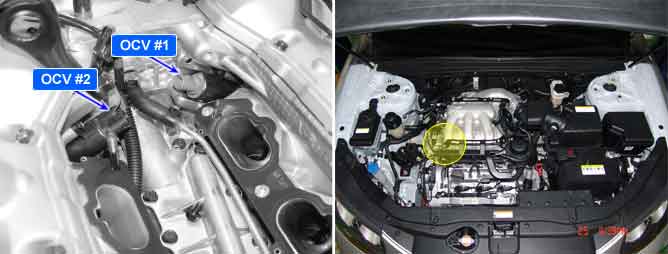 The CVVT (Continuously Variable Valve Timing) system is installed to the chain sprocket of the intake camshaft. This system controls the intake camshaft to provide the optimal valve timing for every driving condition. The PCM controls the Oil Control Valve(OCV), based on the signals output from mass air flow, throttle position and engine coolant temperature. The CVVT controller regulates the intake camshaft angle using oil pressure through the OCV. As result, the relative position between the camshaft and the crankshaft becomes optimal, and the engine torque improves, fuel economy improves, exhaust emissions decrease under overall driving conditions.