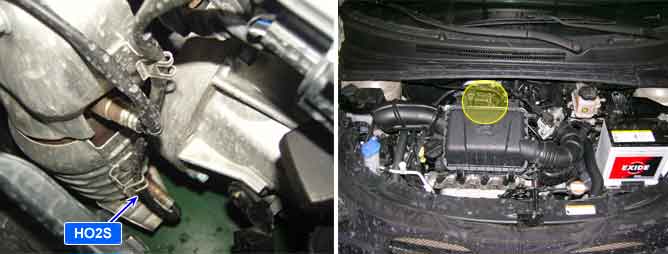 The heated oxygen sensors are mounted on the front side and the rear sied of Catalytic Converter (warm-up catalytic converter), which detects the oxygen concentration in the exhaust gas. The front HO2S signal is used to control air/fuel ratio (closed loop fuel control) and the rear HO2S signal is used to monitor front HO2S and catalyst for proper operation. The heated oxygen snesor (HO2S) produces a voltage that varies between 0V and 1V. When the air/fuel ratio is lean, the oxygen concentration in the exhaust gas increases and the front HO2S outputs a low voltage (approximately 0 ~ 0.1 V).
