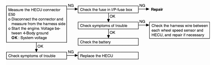 The voltage of the HECU power supply drops lower than or rises higher than the specified value. If the voltage returns to the specified value, this code is no longer output. | Malfunction of wiring harness or connector Malfunction of HECU