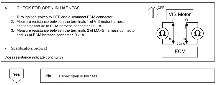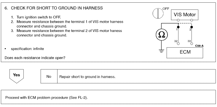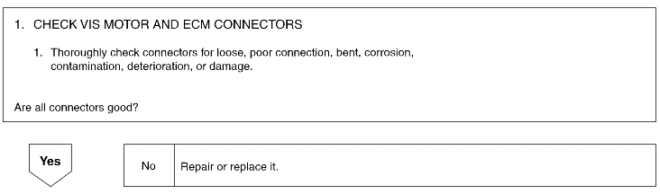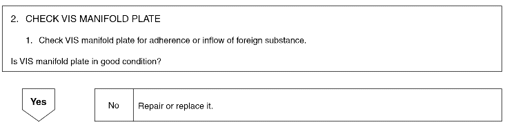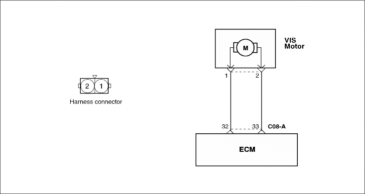 Variable Intake system (VIS) changes the length of intake manifold according to engine speed and engine load to improve the power of engine through the entire range of engine speed, especially through the range of low and middle engine speed.ECM activates VIS motor’s valve to control the direction of intake air passage. At low engine speed, ECM controls VIS motor’s valve to close and the length of intake manifold comes to be longer than normal. And, at high engine speed and load, ECM controls VIS motor’s valve to open and the length of intake manifold comes to be shorter than normal.