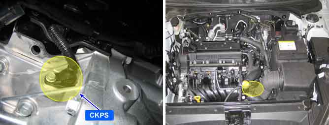 Crankshaft Position Sensor (CKPS) is a hall type sensor that generates voltage using a sensor and a target wheel mounted on the crankshaft. There are 58 slots at 6 degree intervals in the target wheel, and 2 halls are used as missing tooth. CKPS is composed of the two channels that one channel sense engine RPM and the other channel sense direction of engine rotaion. It can check the engine status by using these 2 channels, and it makes the ISG engine restart properly. Also it reduces the delay of first engine start by sensing the status of reverse engine rotation. The ECM calculates engine RPM by using the sensor’ s signal and controls the injection duration and the ignition timing.