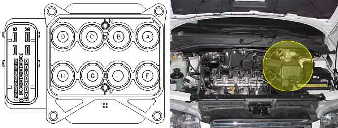 The ABS ECU supplies battery power to all solonid valves by way of a valve relay which is controlled by the Electronic Control UNIT(ECU). The valve relay and all solenoid valves are installed inside the HECU ( Hydraulic and Electronic Control Unit ).