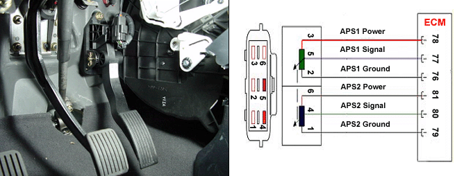 APS(Acceleration Position Sensor) is measuring the driver’s acceleration using a potentiometer and APS signal is transmitted to the ECM The pedal’s position is calculated from the voltage of potentiometer in the APS. The absence of a mechanical link between the accelertor pedal and injection system presents a risk of loss of control of the engine in the event of a failure of the component in the charge of providing the driver’s request information to the injection system. Therefore, APS has the two potentiometers whose slides are mechanically solid. APS 1 decides to the fuel quantity and injection timing in the engine.