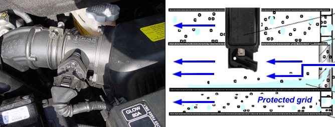 The mass air flow sensor (MAFS) has an intake air temperature sensor built-in and is located between the air cleaner assembly and the throttle device. The MAFS uses a hot film type sensing-element to measure the mass of intake air entering the engine. And send the signal to ECM. A large amount of intake air represents acceleration or high load conditions while a small amount of intake air represents deceleration or idle. The ECM uses this information to control the EGR solenoid valve and correct the fuel amount.