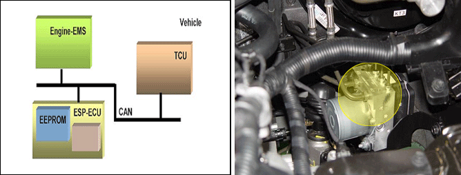 There is no hardware difference of the HECU according to the vehicle’s specification, just software is changed by the vehicle parameter used for ESP control. The HECU stores a classified varient code value according to the received data(a kind of engine, engine displacement, a kind of T/M). After then the HECU read a various parameter according to the stored varient value in the memory to use for the ESP control.