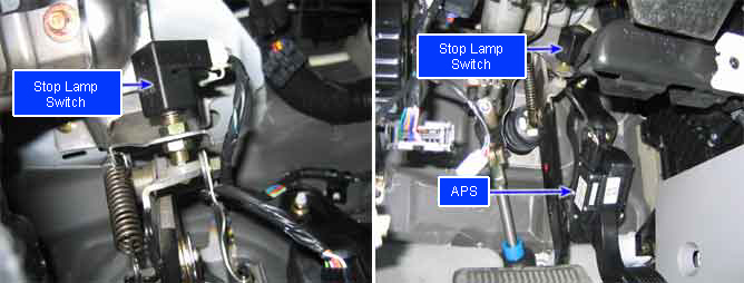 Brake switch is connected to brake pedal and transmits brake operating state to ECM. When the output signal of APS (Accelerator Pedal position Sensor) is higher than what driver intended during driving (e.g. short to high voltage line in APS circuit, false signal ), driver depresses brake pedal. Like this, if driver's decelerating intension is transmitted to ECM (break pedal depressed) when APS output voltage is high, ECM recognizes APS trouble and Limp Home mode is activated. At Limp Home mode, engine speed is fixed at approx. 1250RPM and engine power generation is limited. Even at Limp home mode, if correct APS signal is detected, Limp Home mode is deactivated. Brake switch, which monitors proper operation of APS, is divided switch 1 ('Brake main switch') and switch 2 ('Redundant brake switch') for the fidelity of brake switch.