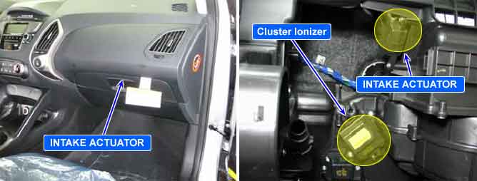 The actuator contains a motor that changes intake door position and a potentiometer that monitors position of the door. When the driver changes the air intake switch, the ECU operates intake door motor to turn the intake door to the intended position. (in the FRESH mode, the intake door is closed. In REC mode, the intake door is opened) During operation the potentiometer delivers an intake door position to the A/C ECU.