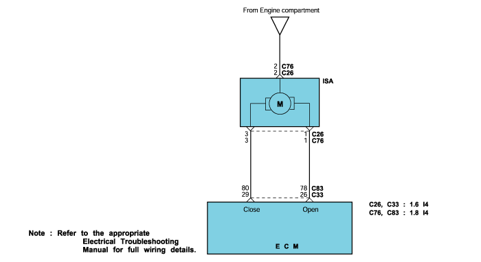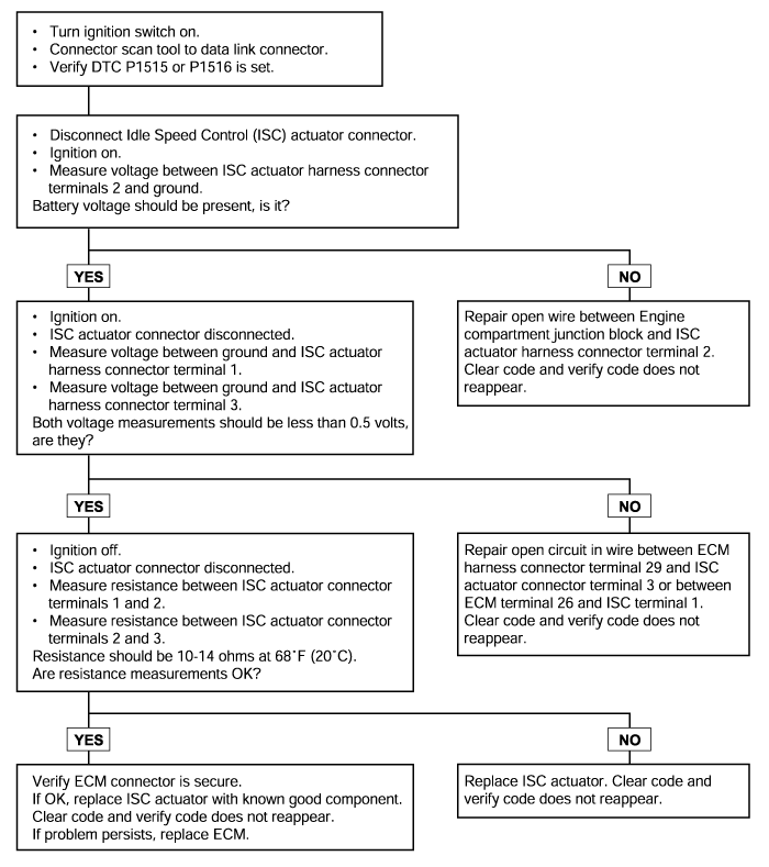 The ECM will set a code and the MIL will turn on if ISC actuator's openingcoil driver stage [for P1515] or closing coil driver stage [for P1516] isshorted to battery voltage during two driving cycles.