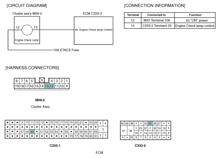 ? Repair open spots between cluster connector(M09-2) terminal 13 and ECM connector(C333-2) terminal 29 and go to "Verification of Vehicle Repair"
