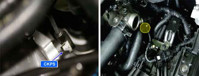 Crank Shaft Position Sensor(CKPS) is magnetic inductive type. Mounted on transaxle hausing, it senses tone wheel position of fly wheel.