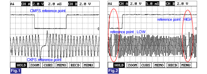 Fig.1) This shows waveform of Crank Shaft Position Sensor and Cam Shaft Position Sensor simulatneously. The middle area indicates reference points of Crank Shaft Position Sensor and Cam Shaft Position Sensor.