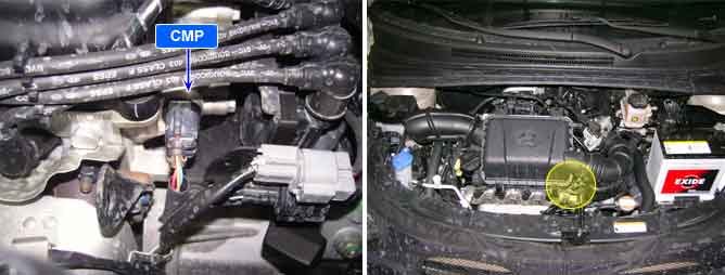 Camshaft Position Sensor (CMPS) is a hall sensor and detects the camshaft position by using a hall element. It is related with Crankshaft Position Sensor (CKPS) and detects the piston position of the each cylinder which the CKPS can’t detect. The CMPS are installed on engine head cover and uses a target wheel installed on the camshaft. This sensor has a hall-effect IC which output voltage changes when magnetic field is made on the IC with current flow. When teeth on the target wheel trigger the sensor, output voltage is 12V. If not, it is 0V. These CMP signal is sent to the ECM and used for determining the ignition timing along with CKP signal. CMPS makes Sequential Injection possible.
