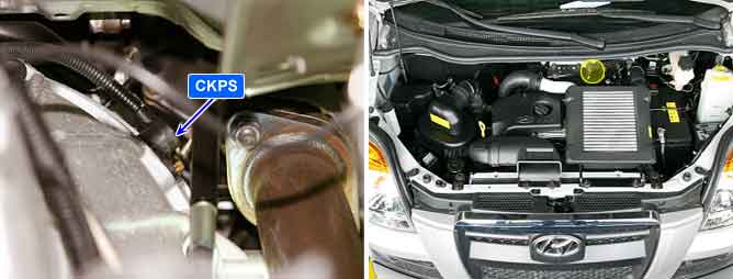 Crank Shaft Position Sensor(CKPS) is magnetic inductive type. Mounted on cylinder block, it senses tone wheel position of crank shaft. As tone wheel is devided with 58 teeth and 2 missing teeth (referrence point), 1 tooth corresponds to 6 degree. CKPS which calculates RPM and crank angle is important to determine fuel injection quantity and injection timing with APS. Crank shaft position is closely related to engine starting.