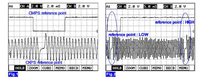 Fig.1) This shows waveform of Crank Shaft Position Sensor and Cam Shaft Position Sensor simulatneously. The middle area indicates reference points of Crank Shaft Position Sensor and Cam Shaft Position Sensor.