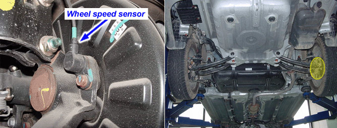 The wheel speed sensor is the essential component the ABS ECU uses to calculate vehicle speed and to determine whether wheel lock occurs. For example, rear wheel speed signal is used as a referecnce value, for vehicle speed, in front wheel drive vehicles, and if a difference between front and rear wheel speed occurs, then ABS control is performed. The wheel speed sensor generates sinewave signals, based on magnetic field made by a permanent magnet in the speed sensor, when the tone wheel rotates. The frequency and AC voltage changes in proportion to the wheel speed, and the HECU determines the speed by calculating the frequeny of the signal.