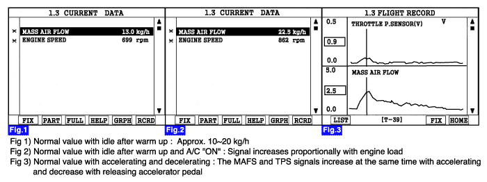 The Mass Air Flow Sensor (MAFS) is located between the air cleaner assembly and the throttle body. The MAFS uses a hot film type sensing element to measure the mass of intake air entering the engine. This hot film type air flow sensor consists of a hot film sensor, housing and metering ducts. Mass air flow rate is measured by detection of heat transfer from a hot film probe. The change in air flow rate causes change in the amount of heat being transferred from the hot film probe surface to the air. A large amount of intake air represents acceleration or high load conditions while a small amount of intake air represents deceleration or idle. The mass of intake air should increase at acceleration and be stable during constant engine speed. The PCM uses this information to determine the injection duration and ignition timing for the desired air/fuel ratio.