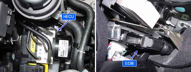 CAN communication is applied just for FTCSs( Full Traction Control Systems) installed in the vehicle for sending requirement data, such as Torque reduction, the number of fuel cut cylinders, and TCS control requests, to the Engine ECM & TCU. The Engine ECM performs fuel cut functions according to requests from the ABS ECU and retards ignition timing by torque reduction requests. The TCU maintains current gear positions during TCS control time, by not increasing power which causes a Kickdown shift.