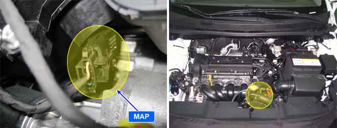 The Intake Air Temperature (IAT) sensor measures the temperature of engine intake air. The Intake Air Temperature (IAT) sensor is a thermistor (a variable resistor that changes along with outside air temperature) in series with a fixed resistor in the ECM. The ECM applies 5V to the IAT sensor. The ECM monitors the voltage across the IAT sensor and converts it into a temperature reading. When the outside air temperature is cold the IAT sensor resistance is high, and when the outside air temperature is warm the IAT sensor resistance is low. Therefore, when the air temperature is cold the ECM will receive a high voltage input, and when the air temperature is warm the ECM will receive a low voltage input. The signal from IAT sensor is used for injection duration correction, ignition timing correction and idle speed correction(Air-density correction).
