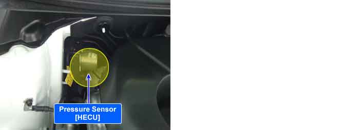 The pressure sensor, installed in the HECU, senses the brake oil pressure to judge a driver's brake intention when the ESP program is operated. If pressure of master cyclinder is applied to pressure sensor, the strain of the piezo element is changed and then the resistance of bridge circuit is changed according to the changed strain. Therefore this changed resistance changes the output voltage of bridge circuit and the output voltage changes linearly. The sensor output is an analog signal in proportion to the supply voltage, and the HECU recognizes a pressure value according to signal ratio about supply voltage.