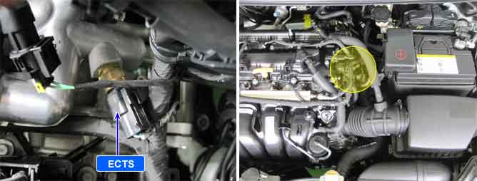 The Engine Coolant Temperature Sensor (ECTS) is located in the engine coolant passage of the cylinder head for detecting the engine coolant temperature. The ECTS uses a thermistor whose resistance changes with the temperature. The electrical resistance of the ECTS decreases as the temperature increases, and increases as the temperature decreases. The reference 5 V in the PCM is supplied to the ECTS via a resistor in the PCM. That is, the resistor in the PCM and the thermistor in the ECTS are connected in series. When the resistance value of the thermistor in the ECTS changes according to the engine coolant temperature, the output voltage also changes.During cold engine operation the PCM increases the fuel injection duration and controls the ignition timing using the information of engine coolant temperature to avoid engine stalling and improve drivability.