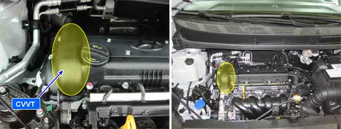Different from the existing fixed cam phase angle type, CVVT(Continuously Variable Valve Timing) is the device which varies cam phase angle continuously to be optimum. And with engine oil pressure, it operates. CVVT consists of OCV(Oil Control Valve) and cam phaser. OCV, mounted on cylinder head, controlls the amount and direction of oil delivered to cam phaser by oil valve which is connected to a solenoid. Cam phaser, rotating cam phaser rotor with pressure and amount of oil produced by OCV, rotates cam shaft forcefully for or against the rotating direction and finally, cam shaft phase changes. With the appliance of CVVT, engine power,fuel efficiency and the quality of exhaust gas are improved.