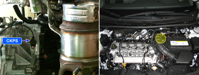 Crank Shaft Position Sensor(CKPS) is magnetic inductive type. Mounted on transaxle hausing, it senses tone wheel position of fly wheel.