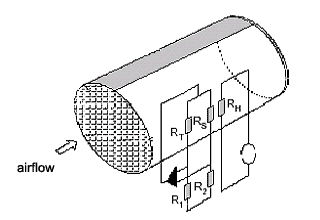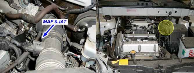 The mass air flow sensor (MAFS) is located between the air cleaner assembly and throttle body. The MAFS uses a hot film type sensing element to measure the mass of intake air entering the engine. This hot film type air flow sensor consist of a hot film sensor, housing and metering ducts. Mass air flow rate is measured by detection of heat transfer from a hot film probe. The change in air flow rate causes change in the amount of heat being transferred from the hot film probe surface to the air. A large amount of intake air represents acceleration or high load condition while a small amount of intake ait represents deceleration or idle. The mass of intake air should increase at acceleration and be stable during constant engine speed. The ECM uses this information to determine the injection duration and ignition timing for the desire air/fuel ratio.