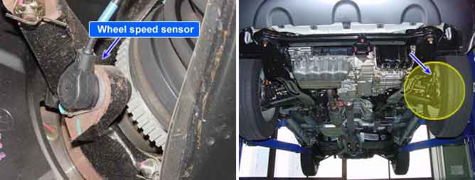 The wheel speed sensor is the essential component the ABS ECU uses to calculate vehicle speed and to determine whether wheel lock occurs. For example, rear wheel speed signal is used as a referecnce value, for vehicle speed, in front wheel drive vehicles, and if a difference between front and rear wheel speed occurs, then ABS control is performed. The wheel speed sensor generates sinewave signals, based on magnetic field made by a permanent magnet in the speed sensor, when the tone wheel rotates. The frequency and AC voltage changes in proportion to the wheel speed, and the HECU determines the speed by calculating the frequeny of the signal.