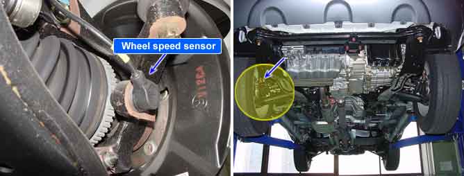 The wheel speed sensor is the essential component the ABS ECU uses to calculate vehicle speed and to determine whether wheel lock occurs. For example, rear wheel speed signal is used as a referecnce value, for vehicle speed, in front wheel drive vehicles, and if a difference between front and rear wheel speed occurs, then ABS control is performed. The wheel speed sensor generates sinewave signals, based on magnetic field made by a permanent magnet in the speed sensor, when the tone wheel rotates. The frequency and AC voltage changes in proportion to the wheel speed, and the HECU determines the speed by calculating the frequeny of the signal.