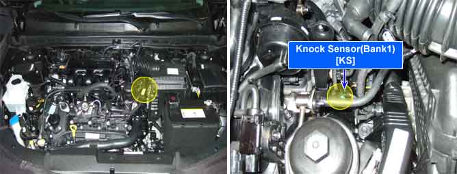 The knock sensor is attached to the cylinder block and senses engine knocking. The sensor contains a piezoelectric element that converts vibration (or noise) into voltage signal and sends this signal to PCM. With input signals from camshaft position and crankshaft position sensor, PCM can identify which cylinder is knocking. PCM filters vibrations and determines if the vibrations are knocking signal. The Engine Control Module (PCM) uses this signal to suppress knocking by retarding ignition timing. The PCM will set a code (Malfunction Indicator Lamp will Not turn on) if during two driving cycles the Knock sensor’s output voltage falls below minimum threshold. This code indicates an unexpected vibration is being read by the Knock sensor or PCM under normal engine operation.