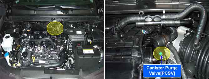 The evaporative emission control system prevents hydrocarbon (HC) vapors from the fuel tank from escaping into the atmosphere where they could form photochemical smog. Gasoline vapors are collected in the charcoal canister. The PCM controls the Purge Control Solenoid Valve (PCSV) to purge any collected vapors from the canister back to the engine for combustion. This valve is actuated by the purge control signal from the PCM and controls fuel vapor from the canister to the intake manifold.
